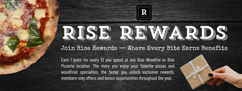 Rise Rewards is our way of saying thank you for being part of the Rise family. Whether you’re visiting Rise Woodfire or grabbing your favorites from Rise Pizzeria, every dollar you spend earns you points toward delicious rewards. Members also enjoy exclusive offers, bonus-point opportunities, and early access to special promos. Signing up is fast, free, and takes less than a minute—just enter your phone number or email to get started.